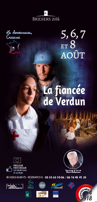 | Fresque de Bridiers 2016 5 au 8 août 2016 Du 5 au 8 août, le site de Bridiers (La Souterraine) se métamorphose en un gigantesque théâtre de 5ha à ciel ouvert... 400m d'ouverture de scène, 200m de profondeur avec un amphithéâtre de 2 000 places, un spectacle à la scénographie poignante où la lumière, la musique, les effets spéciaux et la proximité des acteurs en costume entrainent au cœur de l'action ... Devenez les acteurs inattendus de cette fresque historique grandiose, rétrospective de l'année 1916, qui vous mènera sur le front mais aussi à l'arrière où la vie continue... mêlant douleurs, larmes, privations mais aussi ... L'AMOUR Vivez les événements qui ont jalonné cette année charnière comme un film en direct: 26 janvier 1916... ...un Zeppelin largue un obus sur le quartier de Ménilmontant à Paris faisant de nombreuses victimes et dégâts. Lucie, jeune lingère, prend alors conscience de cette guerre qu'elle croyait loin de chez elle. Elle décide de quitter sa famille, ses amis, son quartier et de s'engager dans la Croix Rouge comme infirmière en demandant à partir sur le front soigner les soldats... 21 février 1916... ...débute l'une des batailles les plus meurtrières de la Grande Guerre... VERDUN! François, jeune Creusois originaire de Bridiers se retrouve au cœur de l'enfer... 6 mars 1916... ...lors d'un assaut à la cote 304, François est blessé par un éclat d'obus et est évacué aussitôt à l'arrière du front. Il sera accueilli par Lucie .... Elle deviendra... LA FIANCÉE DE VERDUN | |